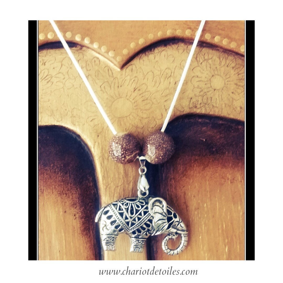 Collier fait main avec tissus blanc satiné, fermoir argenté, breloque Éléphant au design très précis avec deux perles de porcelaine de couleur marron.