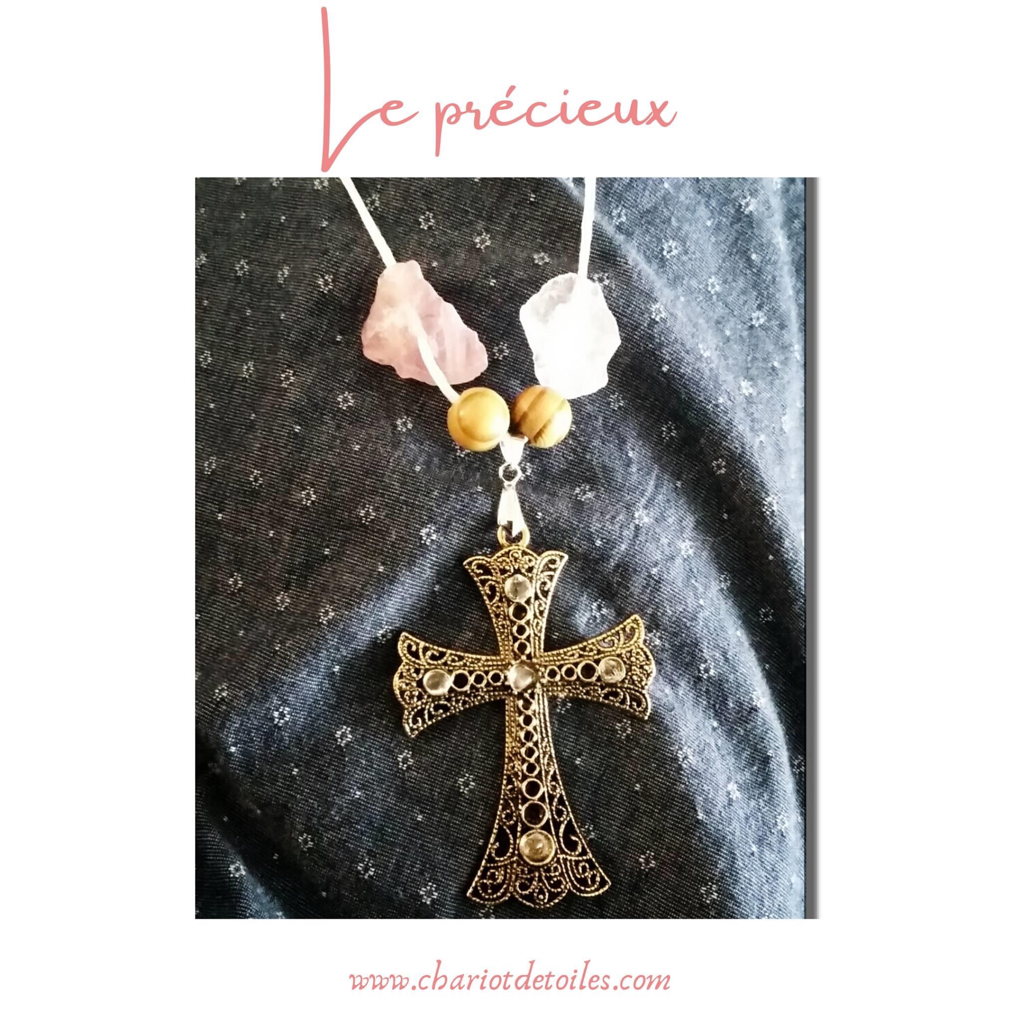 Le Précieux : Création artisanale, collier avec cordon satiné blanc, deux morceaux de Quartz Rose, deux perles en bois, une croix en métal avec morceaux de Cristal de Roche sur la croix.