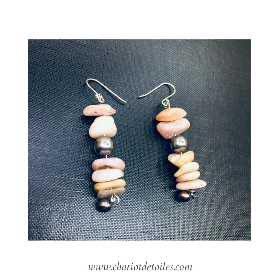 Les Galets, Paire de boucles d’oreilles, fait main avec crochets en argent, perles de Rhodonite et acier inoxydable, breloque boule en acier inoxydable.