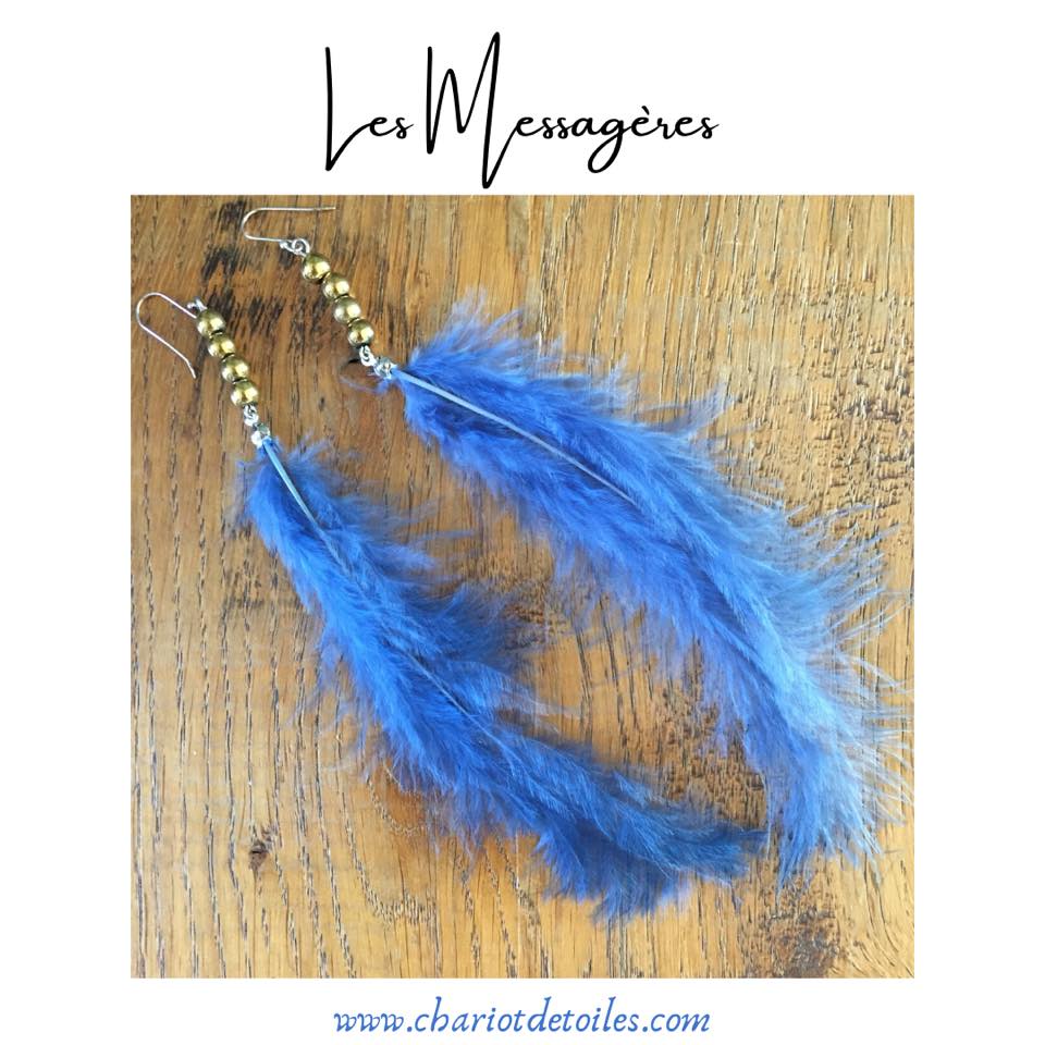 Les Messagères, paire de boucles d’oreilles fait main, avec crochets en argent, plumes bleues et perles de pyrite.