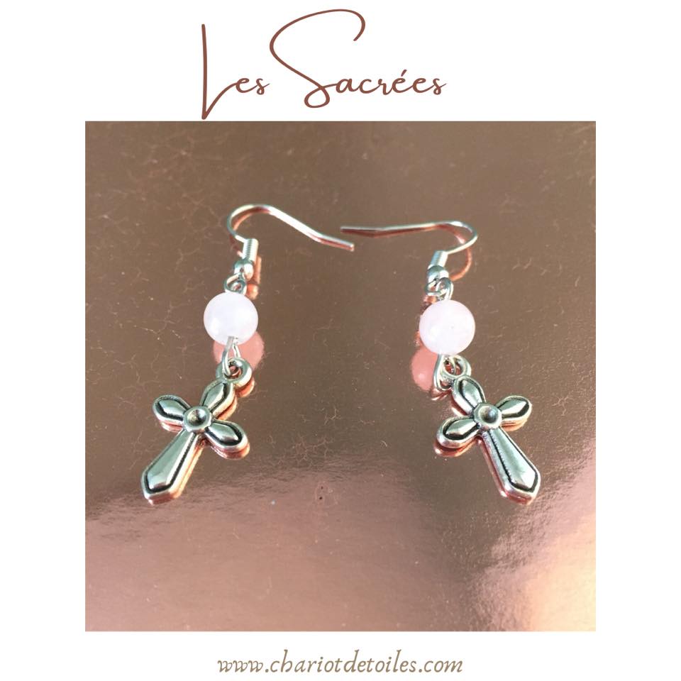 Les sacrées, paire de boucles d’oreilles avec perles de Quartz rose et croix sacrées.